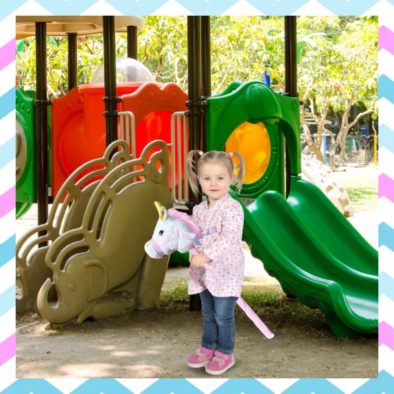 * Capul de Unicorn pozitionat pe o tija, este jucaria ideala pentru simularea calaritului, acesta contribuie la dezvoltarea echilibrului, a coordonarii, si a musculaturii picioruselor;