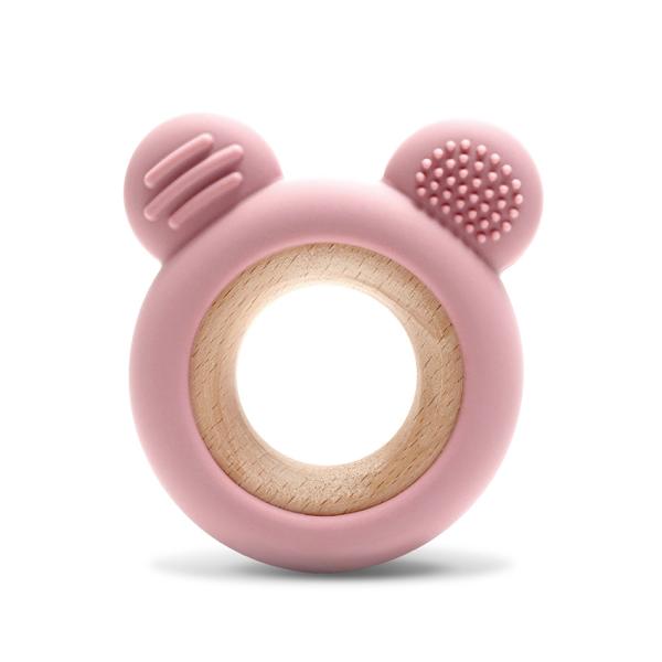 Jucarie de dentitie din silicon si lemn de fag 0 luni+ Bear Pink