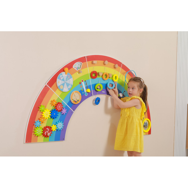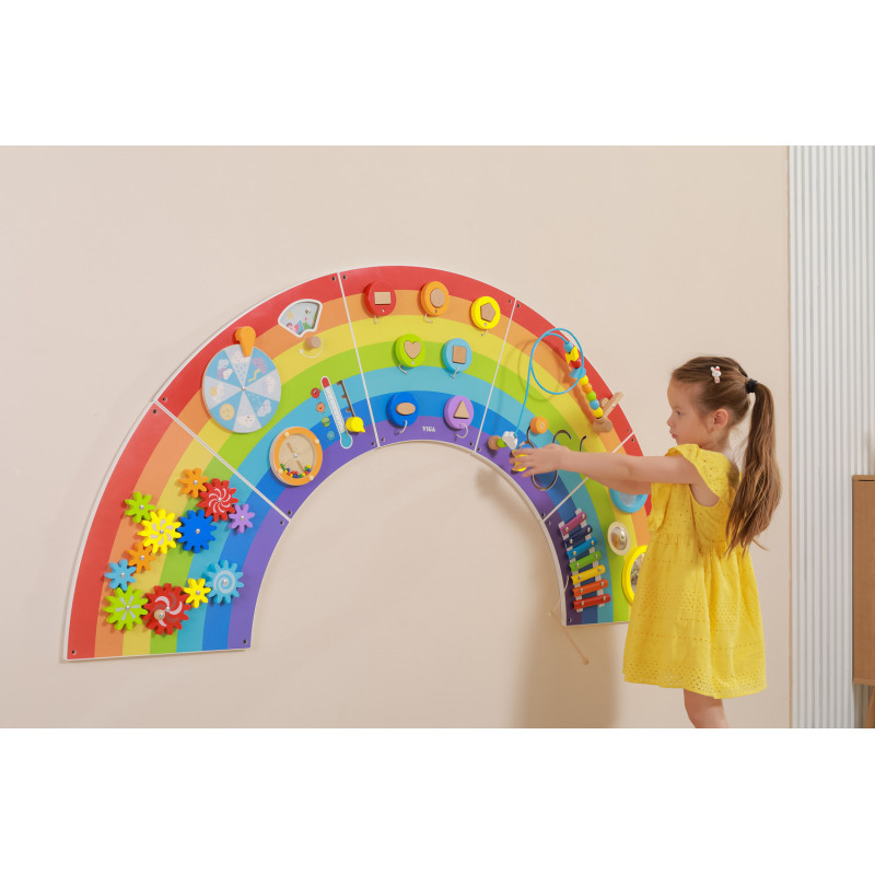 Aceasta jucarie de perete curcubeu include unele dintre cele mai indragite jucarii si elemente: roti dintate, panou de vreme, blocuri de potrivire a formelor, xilofon, oglinda concava si convexa, gong si margele pe sine.