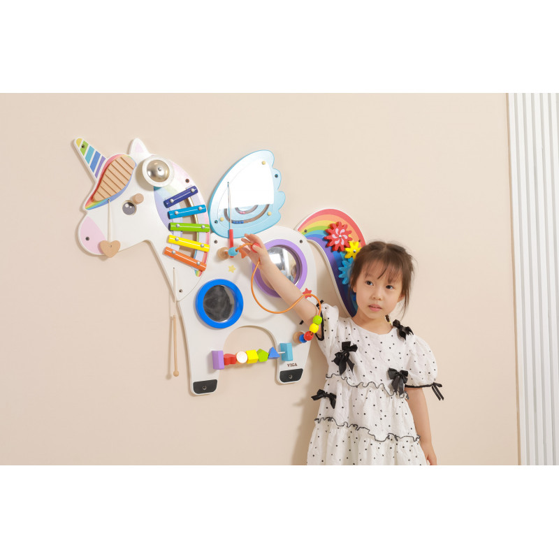 Aceasta jucarie de perete in forma unui unicorn frumos include caracteristici foarte indragite de copii, cum ar fi roti dintate, margele de sarma, xilofon, oglinda concava si convexa, labirint, gong etc.