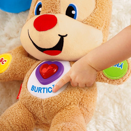 Catelusul este acelasi prieten moale, dragastos care raspunde la atingerea bebelusului cu fraze dragute si cantece ritmate in limba romana