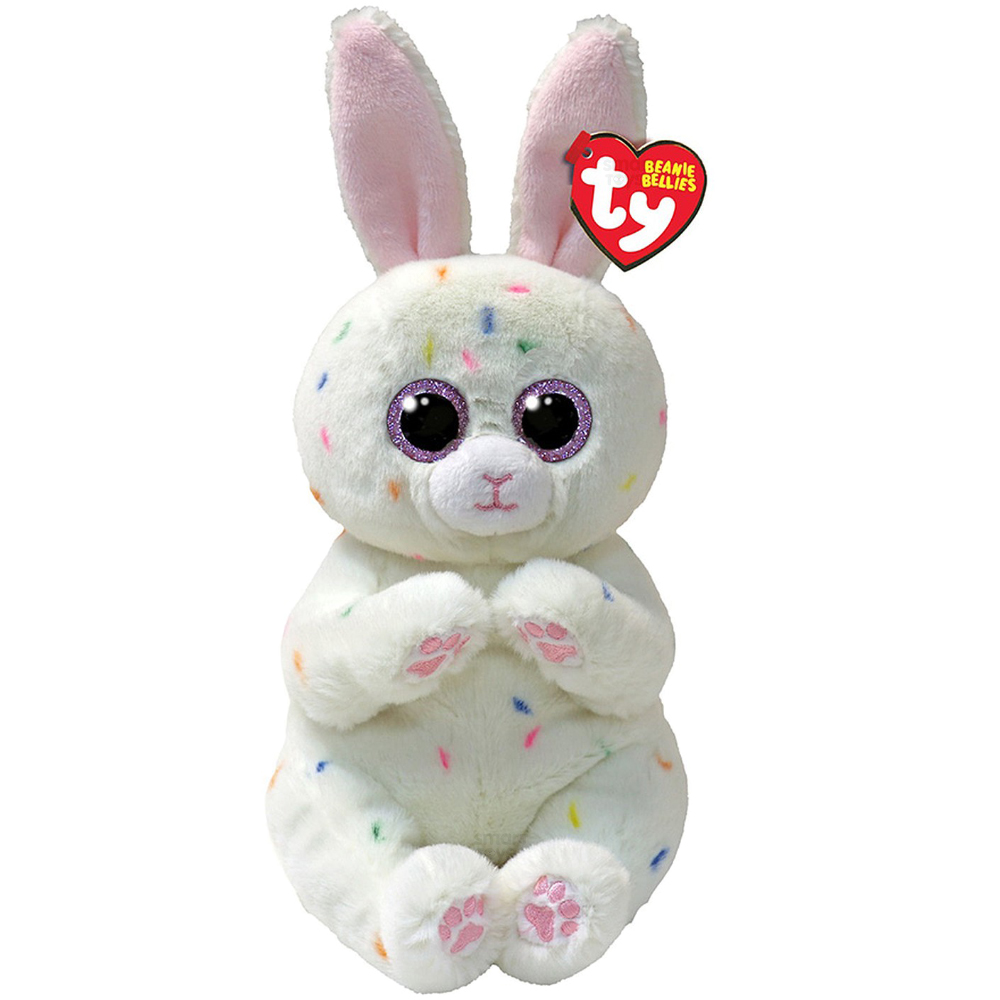 Un iepuras adorabil, imbracat festiv in alb cu pete multicolore, cu efect linistitor si de care te indragostesti usor;