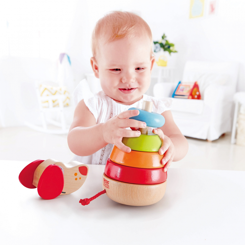 O jucarie distractiva de stivuire cu o intorsatura dulce, stivuiti cele sase piese colorate una peste alta.