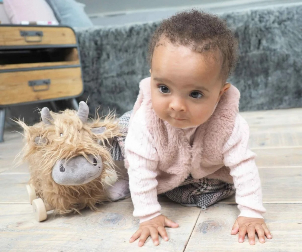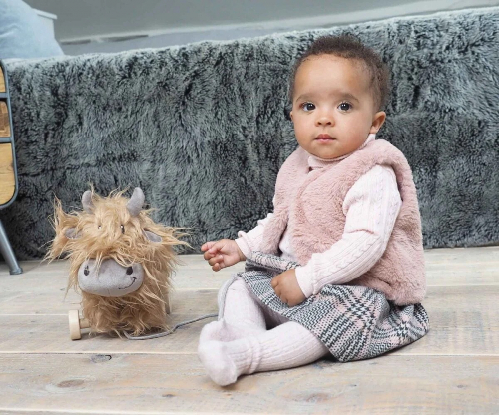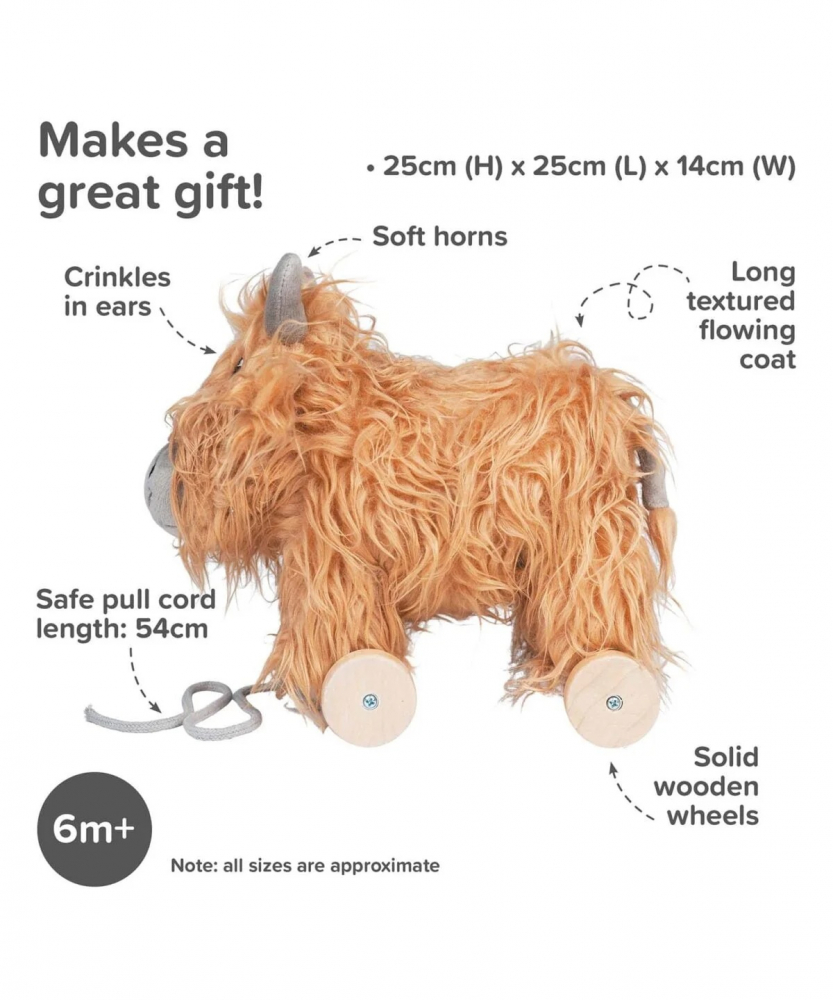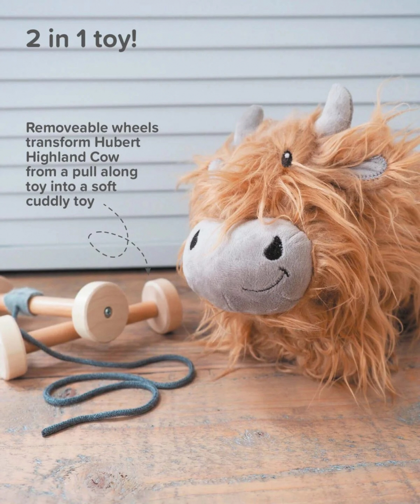 Roțile din lemn pot fi îndepărtate cu ușurință, transformându-l pe Hubert într-o jucărie de pluș Highland Cow moale și drăgălașă, pe care copiii mici o pot îmbrățișa și cu care se pot juca.