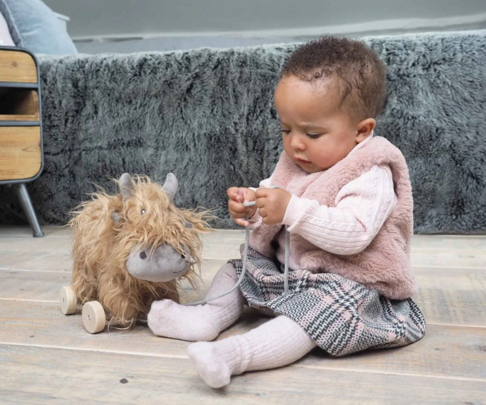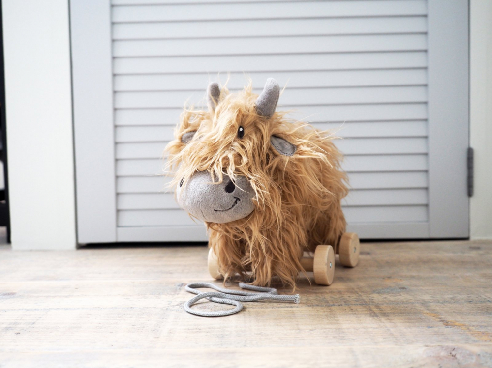 Jucarie de tras pentru copii Little Bird Told Me cu roti detasabile Hubert Highland Cow