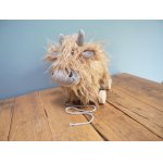 Acest ursuleț de pluș cu caracter de vacă din Highland are o haină texturată și fluidă și coarne lungi.