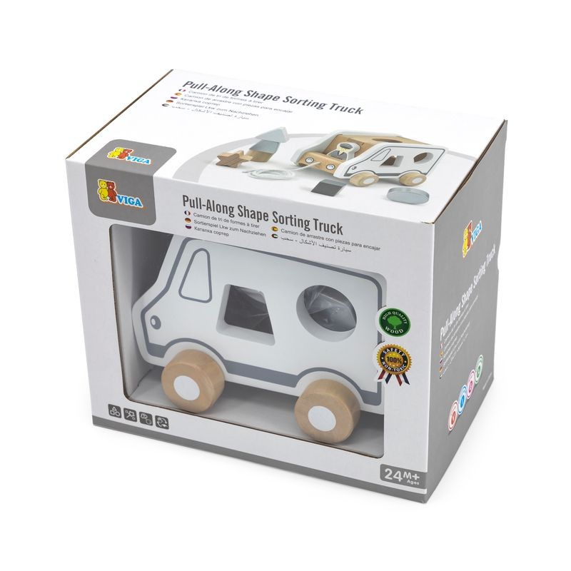 O jucarie clasica intr-un design nou, de inspiratie scandinava. Un camion sortator de forme care poate fi tras sau impins, din lemn, decorat in tonuri de alb si gri cu vopsele pe baza de apa.