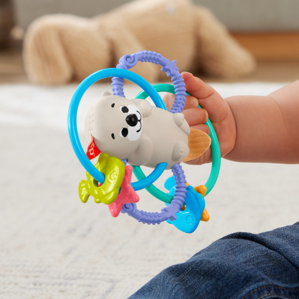 Jucarie pentru dentitie cu tematica vidra, cu inele flexibile, special concepute pentru ca mainile mici sa le apuce si sa se rasuceasca.