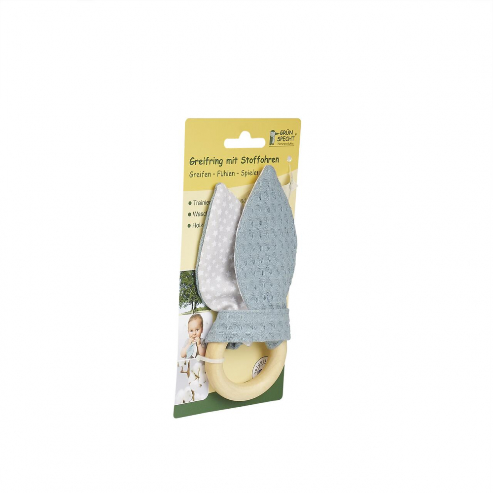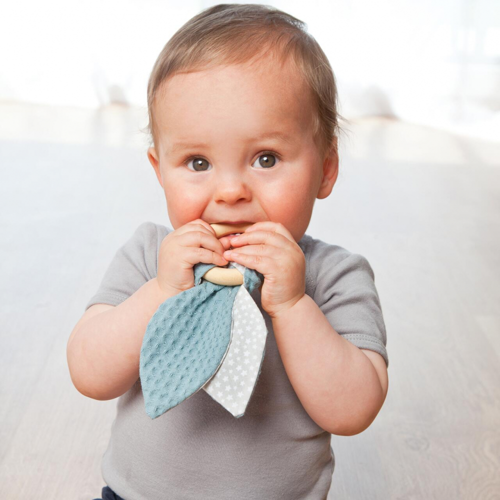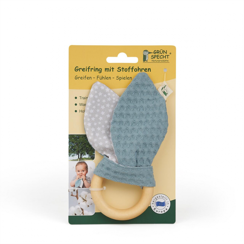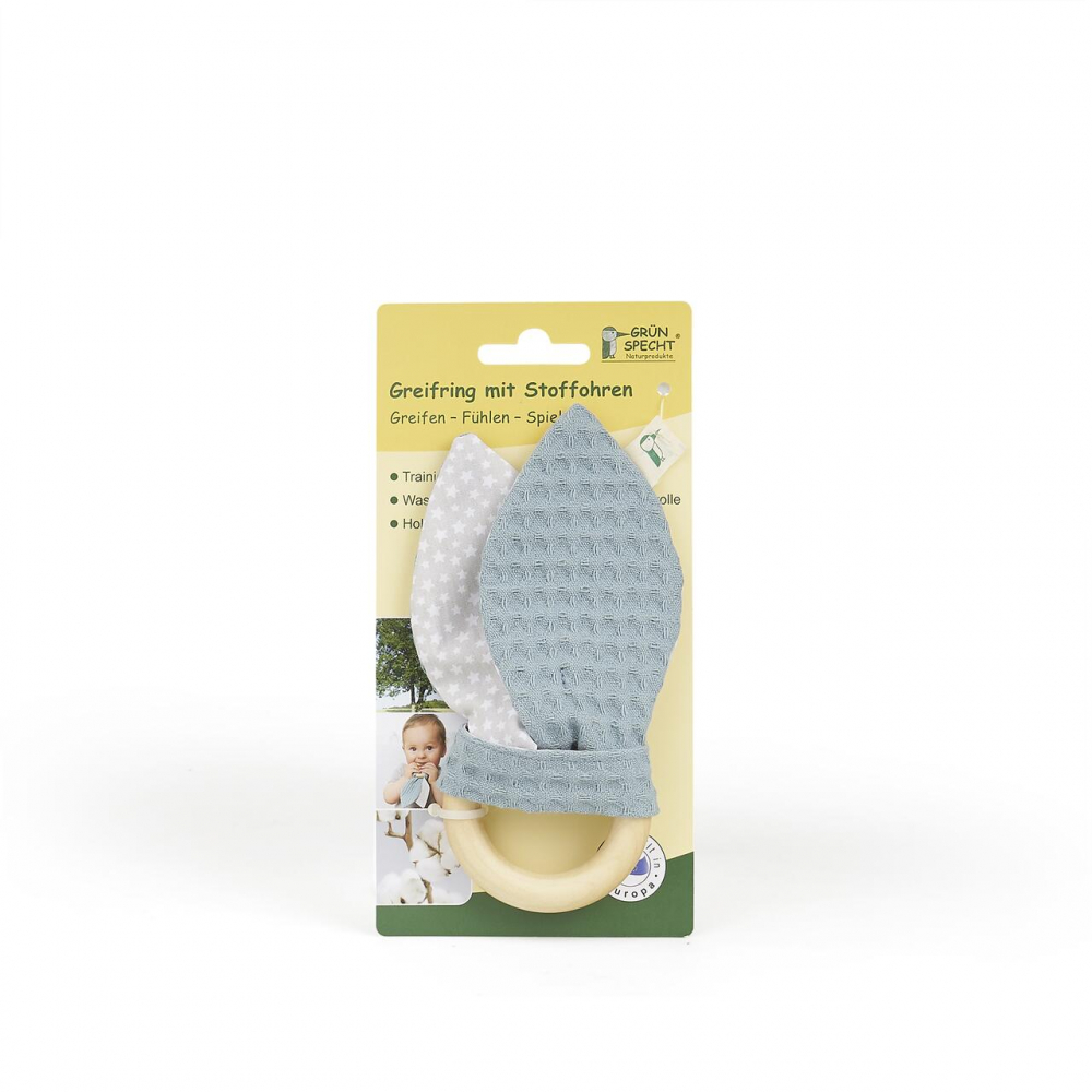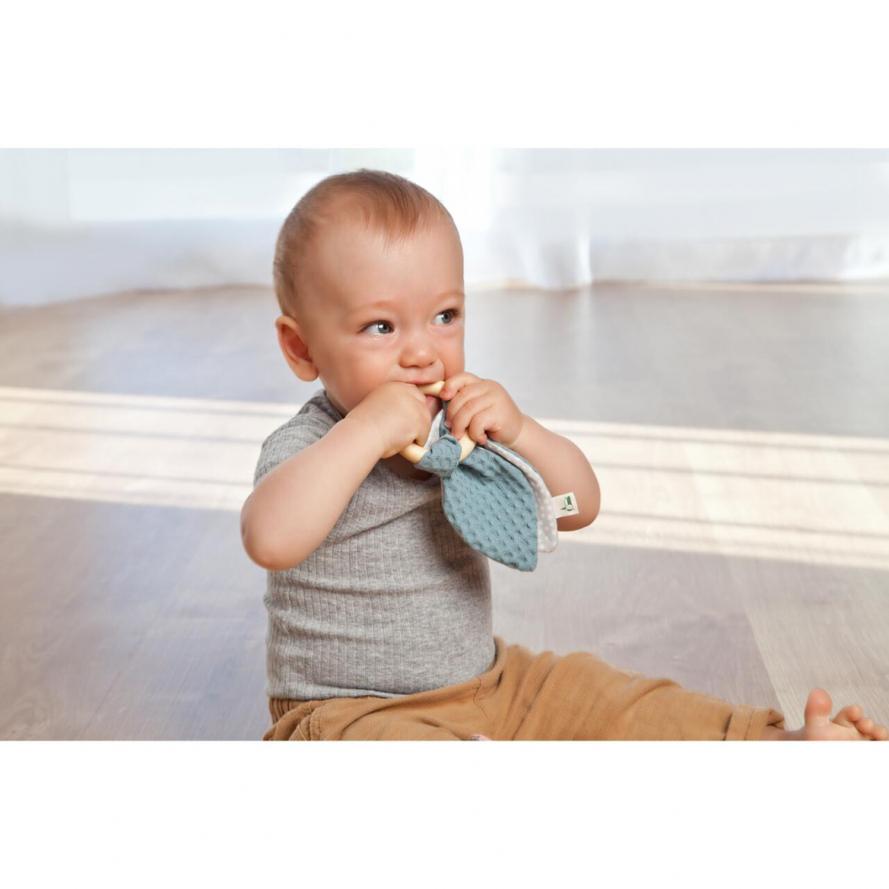 Jucarie dentitie Gruenspecht din bumbac cu inel din lemn albastru