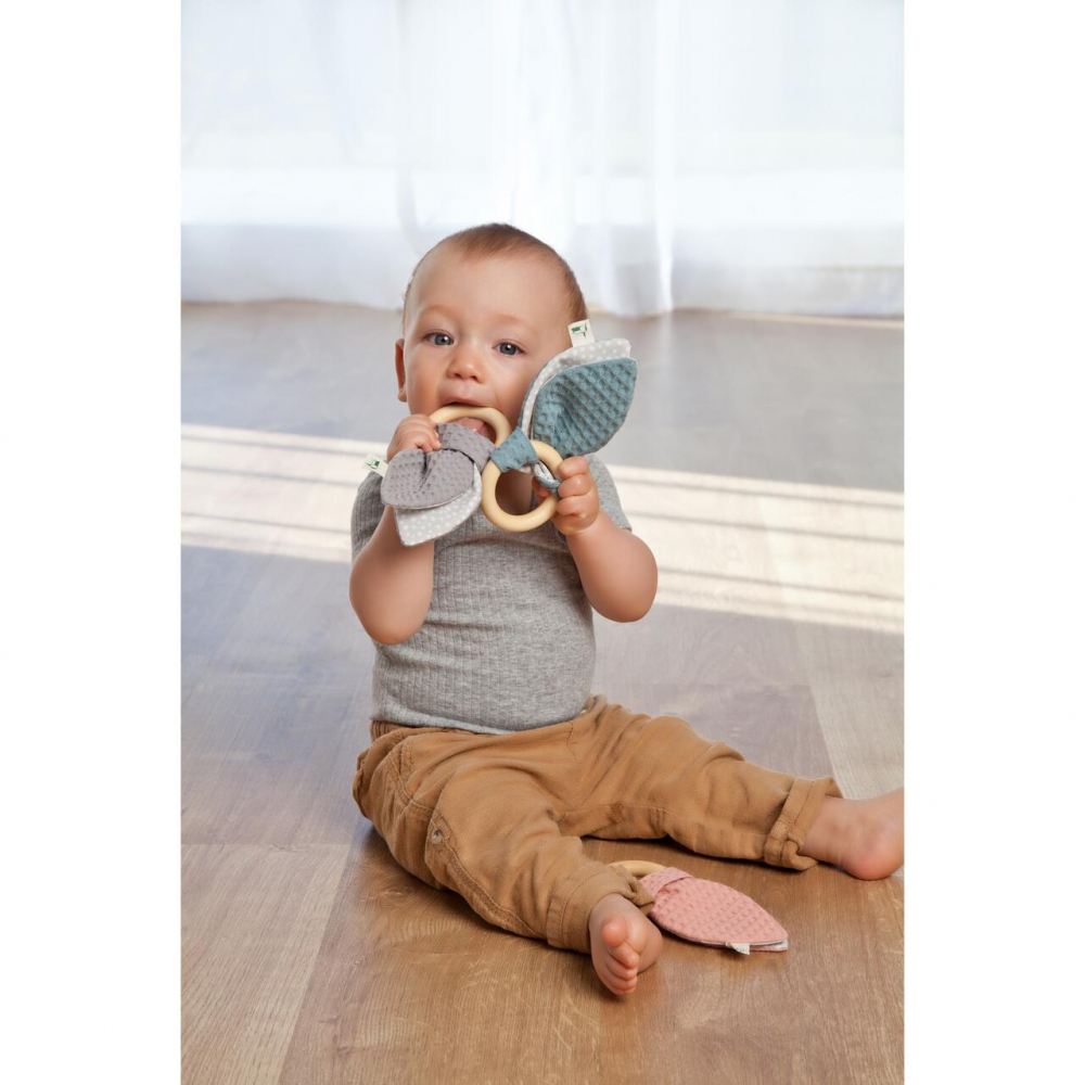 Aceasta jucarie cu aspect atragator, este potrivita pentru bebelusi in perioada de dezvoltare pentru ca antreneaza simtul tactil, avand doua parti componente diferite: partea tare in forma unui inel din lemn masiv și partea mai moale, in forma a doua urechi flexibile de iepuras din bumbac.