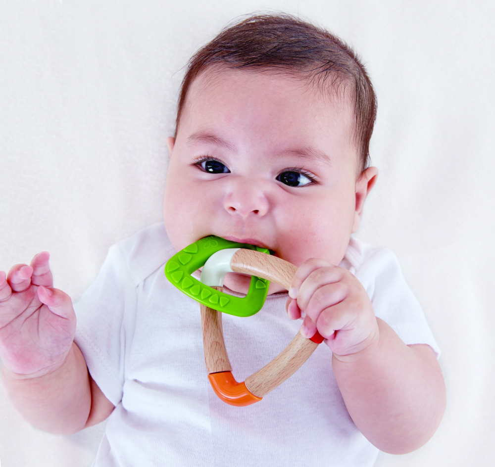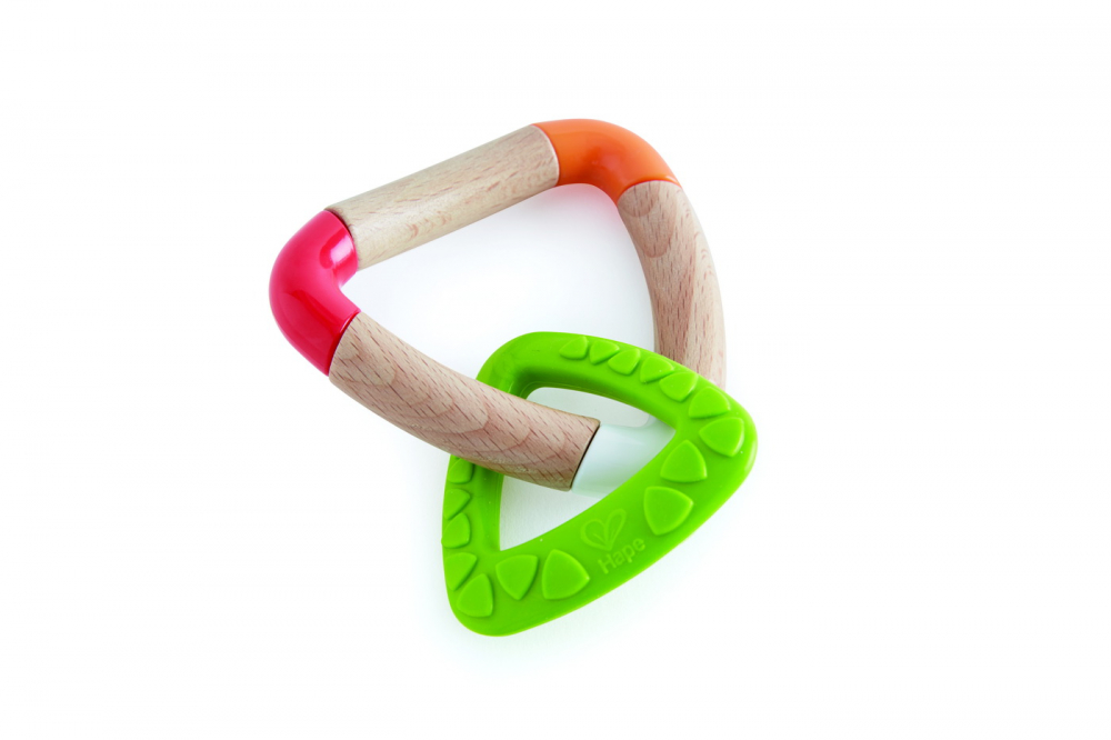 Manerul din lemn este placut la atingere si sigur de mestecat, iar triunghiul pentru dinti este fabricat din silicon fara BPA.