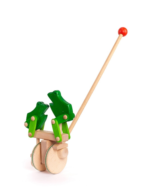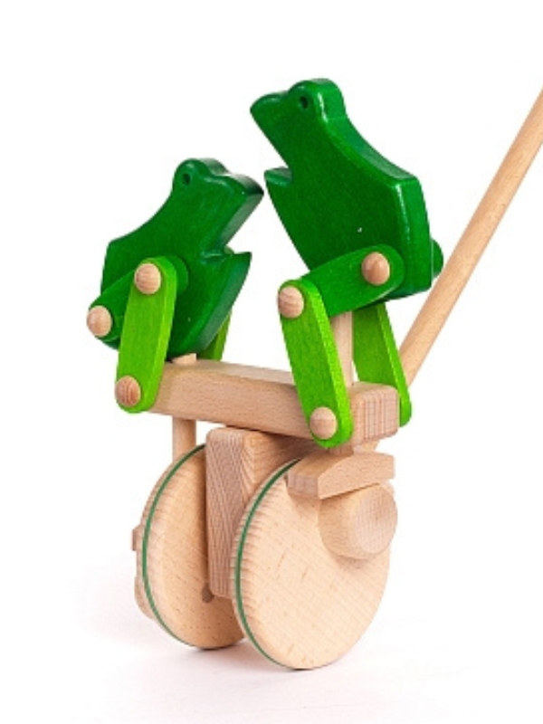 Ce zici de o jucarie din lemn, care sa ii tina pe cei mici antrenati si sa le dezvolte, in acelasi timp, abilitati importante? Broscutele saltarete din lemn verde cu galben, de la Bajo, cu siguranta vor deveni jucaria preferata a prichindelului tau. Trage broscutele inainte sau inapoi, iar ele vor sari una mai sus decat cealalta, imitand miscarile broscutelor reale!