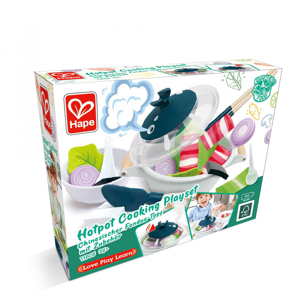 Acest set de joaca colorat include o oala, betisoare, cutit de joaca, lingura si imitatii de ingrediente proaspete.