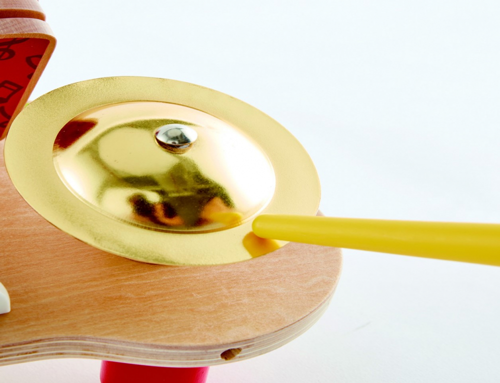 Jucaria din lemn pentru copil include o toba, xilofon, chimval, scratchboard, clapa si doua bete.