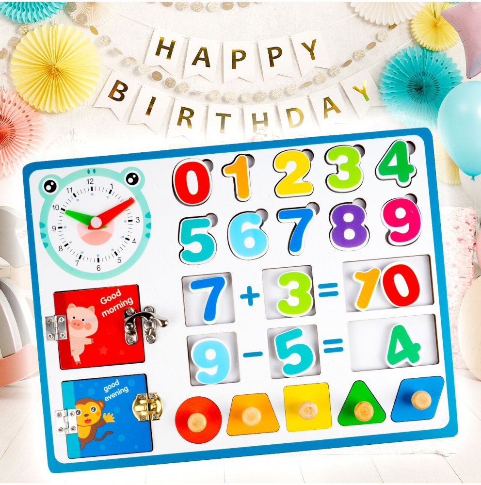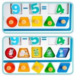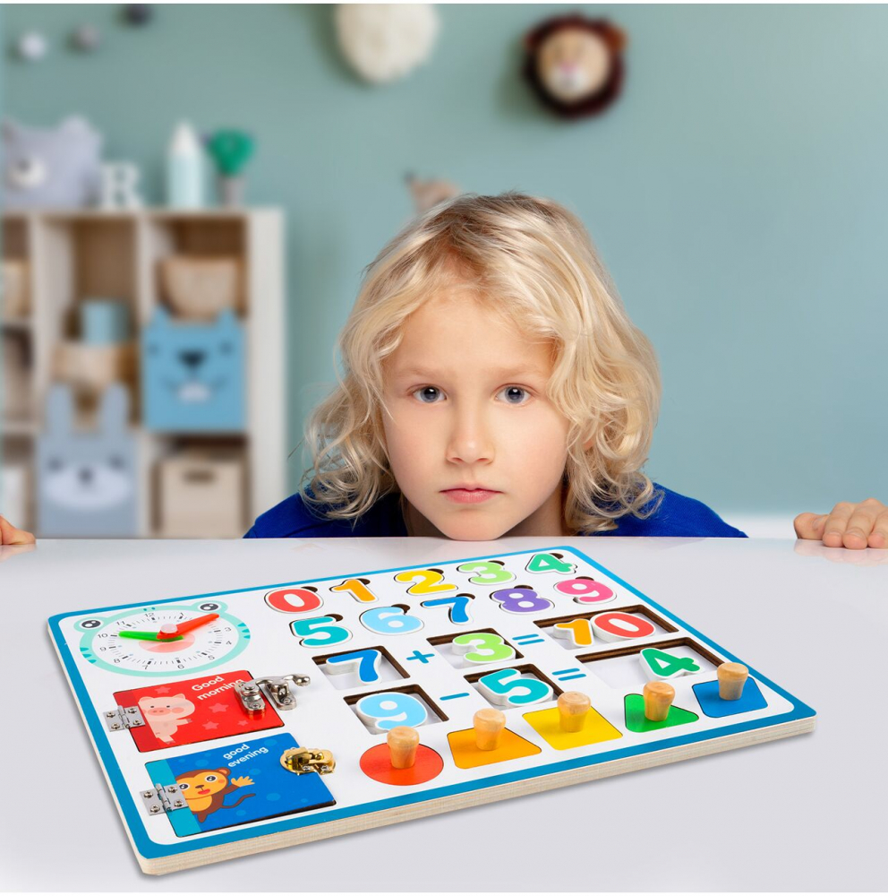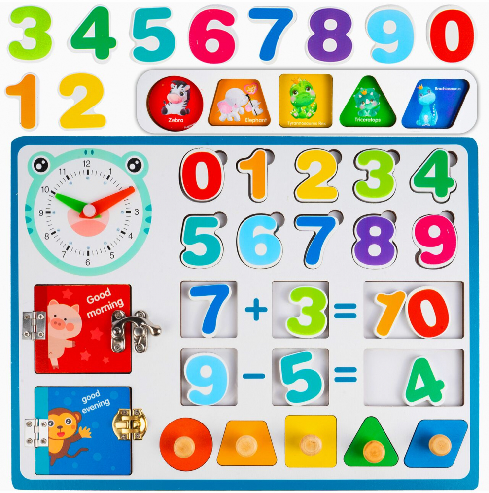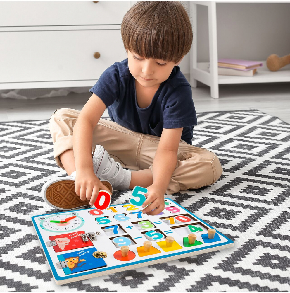 Pe tablă sunt locuri unde putem pune numere și figuri geometrice, datorită cărora copilul învață forme. În plus, după rezolvarea unei operații matematice, putem cere copilului să adauge rezultatul. Alege învățarea prin joc!
