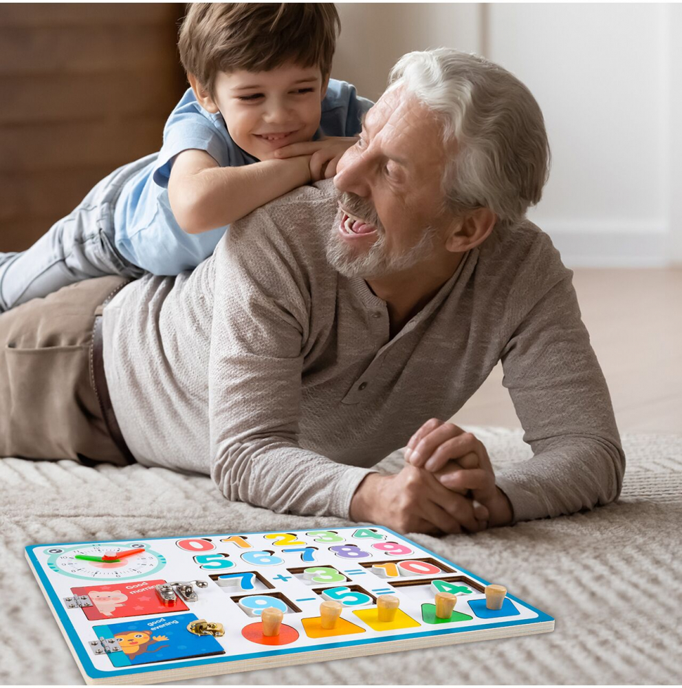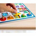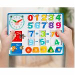 Jucarie educationala din lemn cu Cifre Figuri geometrice si Ceas din lemn Multicolor
