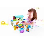 O noua dimensiune a sortatorului multitasking. Asezati animalele la bordul Arcei lui Noe si asigurati-va ca fiecare animal isi are locul potrivit. Numiti animalele si lasati copilul sa imite. Arca lui Noe a fost special conceputa astfel incat animalele sa poata fi depozitate acolo dupa joc pentru a economisi spatiu.