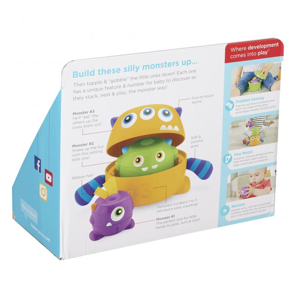 Fiecare monstrulet are un sunet si o textura deosebita pentru ca bebelusul tau sa o descopere, micutii le pot folosi pe rand sau le pot stivui