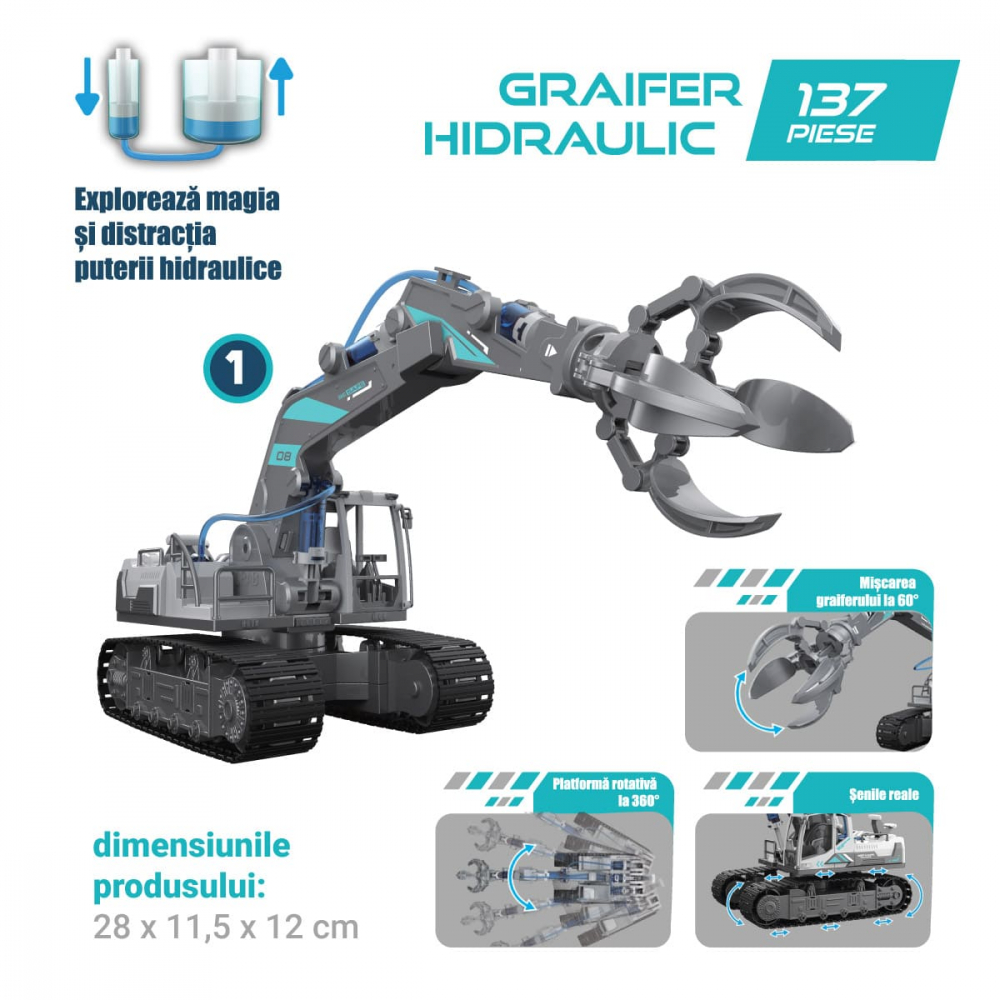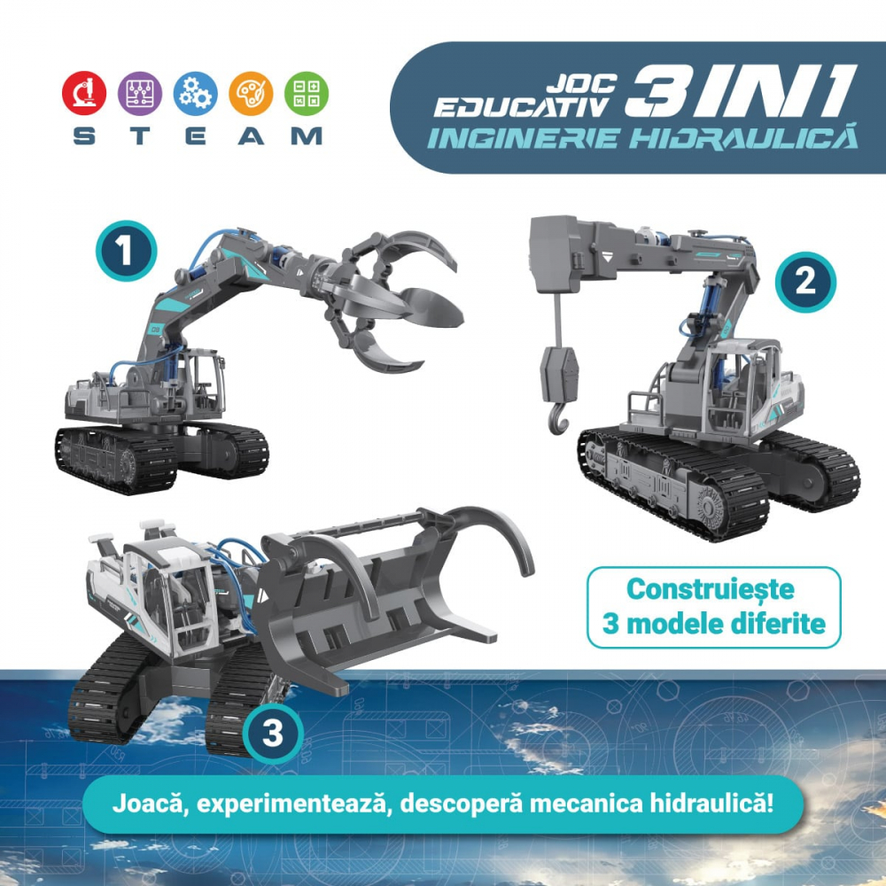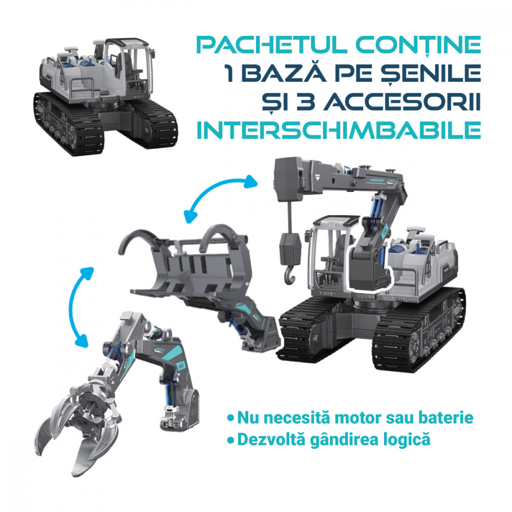 Acest set inovator le permite copiilor să construiască și să experimenteze trei modele diferite: un încărcător hidraulic, o macara hidraulică și un graifer hidraulic.