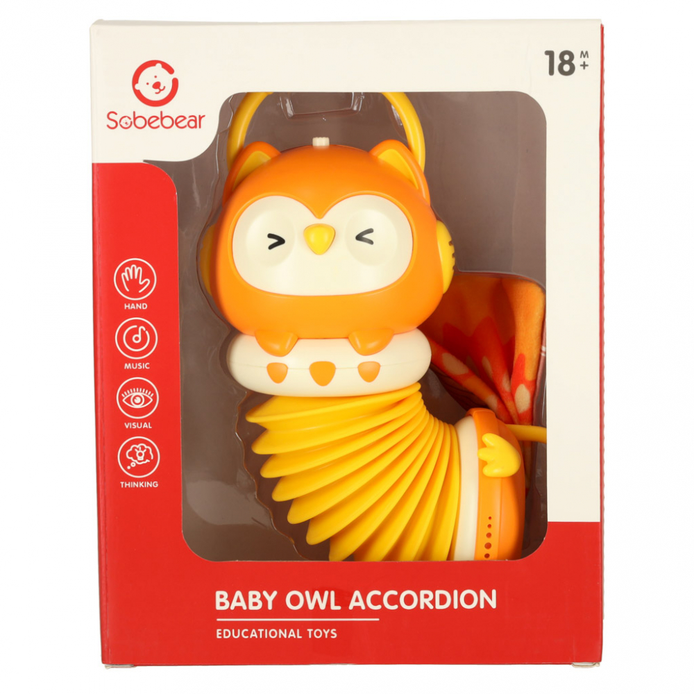 Jucaria muzicala pentru bebelusi Bufnita Acordeon portocalie cu LED, va fi perfecta ca prima jucarie muzicala a copilasului dumneavoastra!