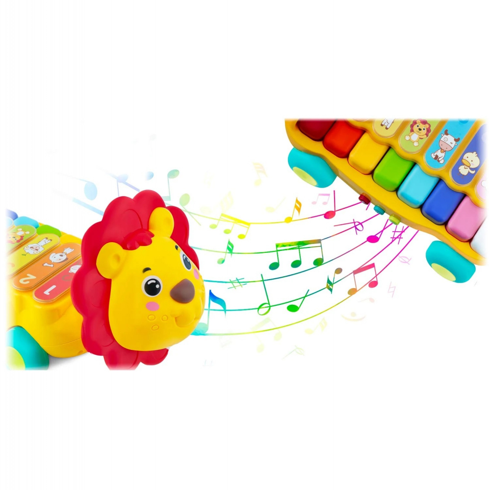 Jucarie muzicala Ricokids Rolling Lion cu Xilofon, Pian cu 3 functii, 8 note muzicale, 8 melodii ,sfoara de tras si betisoare incluse
