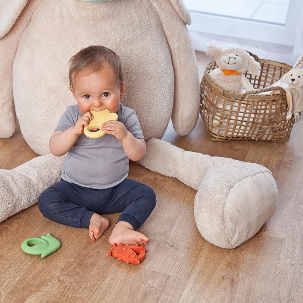 Jucaria pentru bebelusi in forma de gargarita, din cauciuc natural organic, este destinata jocului si rosului. Partea externa din cauciuc organic le este de ajutor bebelusilor pentru a sustine procesul de dentitie. Datorita suprafetei sale structurate si a structurii moi, maseaza usor gingiile bebelusului in timp ce o mesteca.