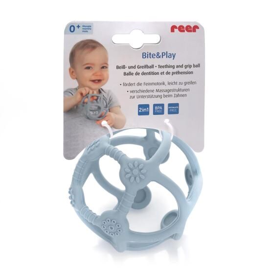 Jucarie Reer Bite&Play pentru dentitie si minge 2 in 1 silicon 0 luni+ albastra