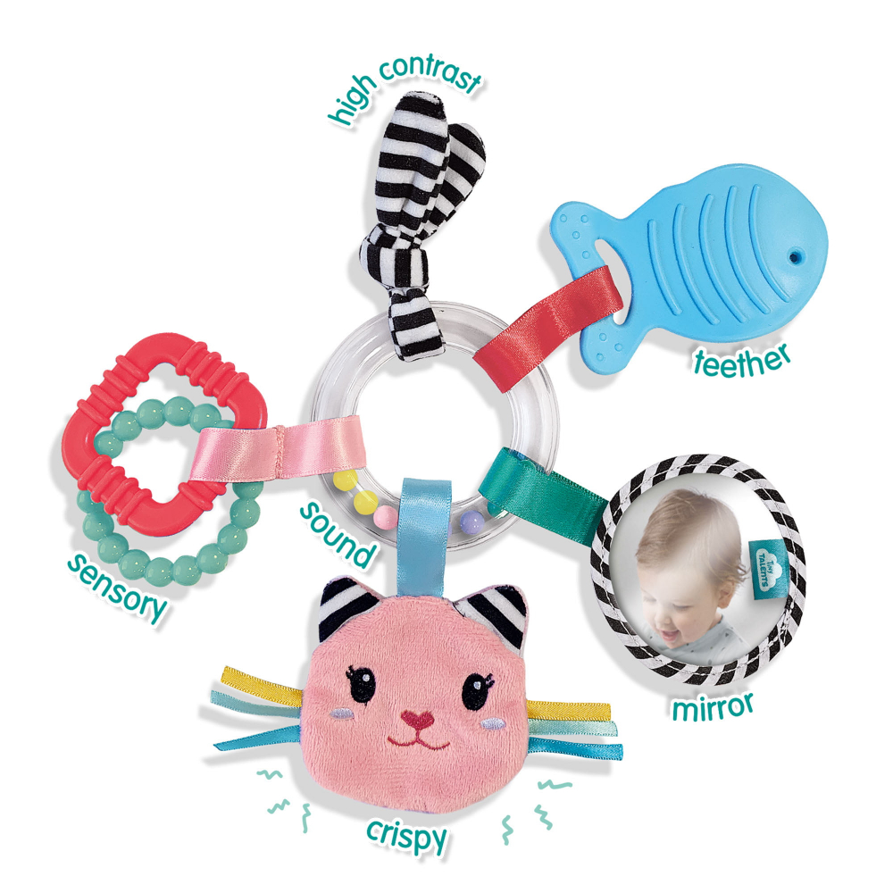 Cu acest inel de joaca practic, copiii se pot distra cu diverse activitati. Mestecati jucarii cu texturi, o pisica cu mustati agitate, o oglinda sau elemente cu contrast ridicat pentru dezvoltarea vizuala.
