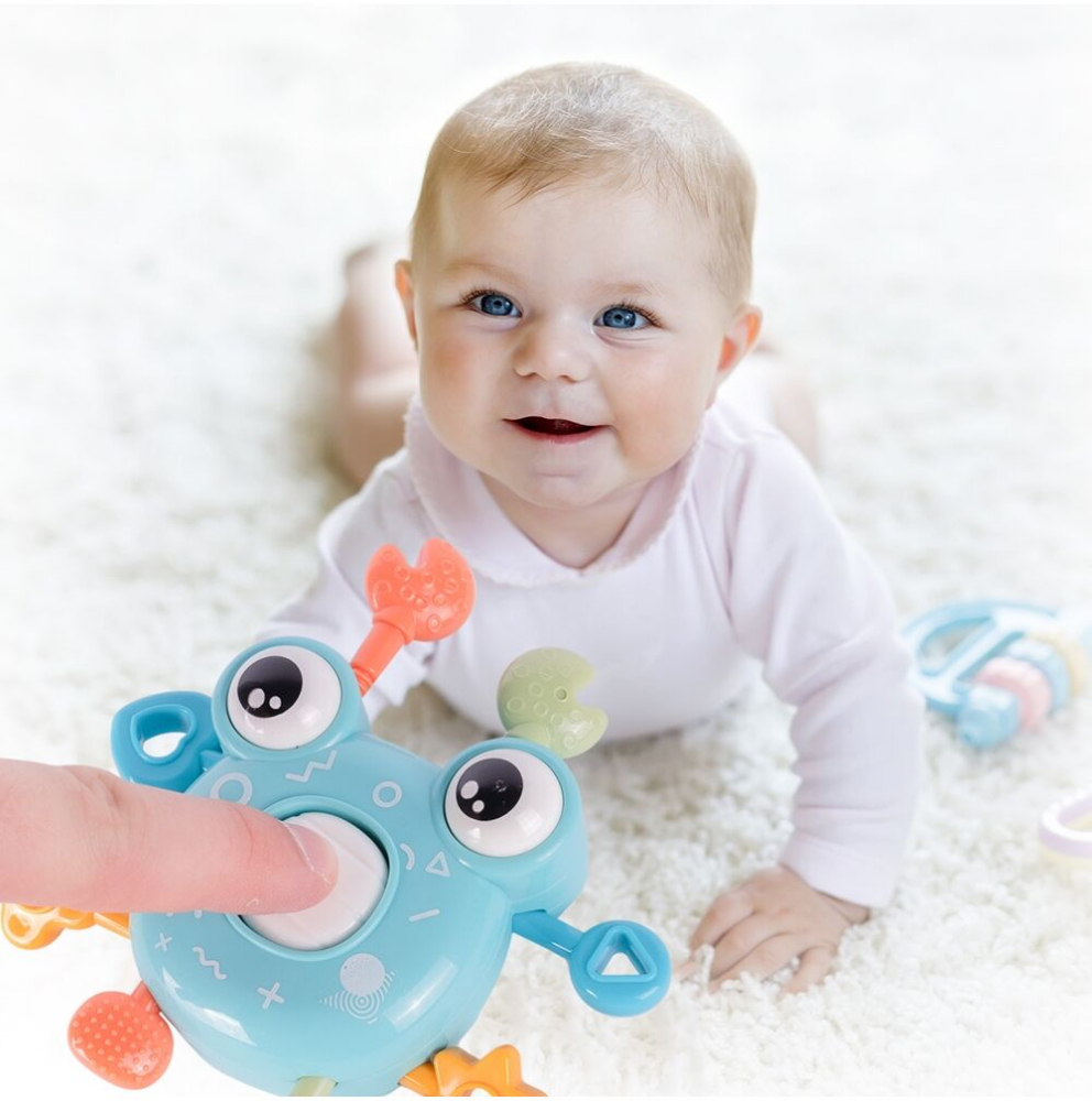 Acest simpatic crab capteaza atentia bebelusului si-l invata incet-incet, notiunea de cauza si efect.
