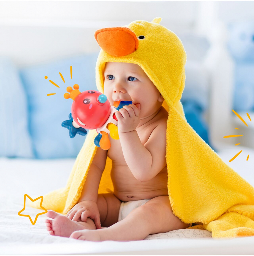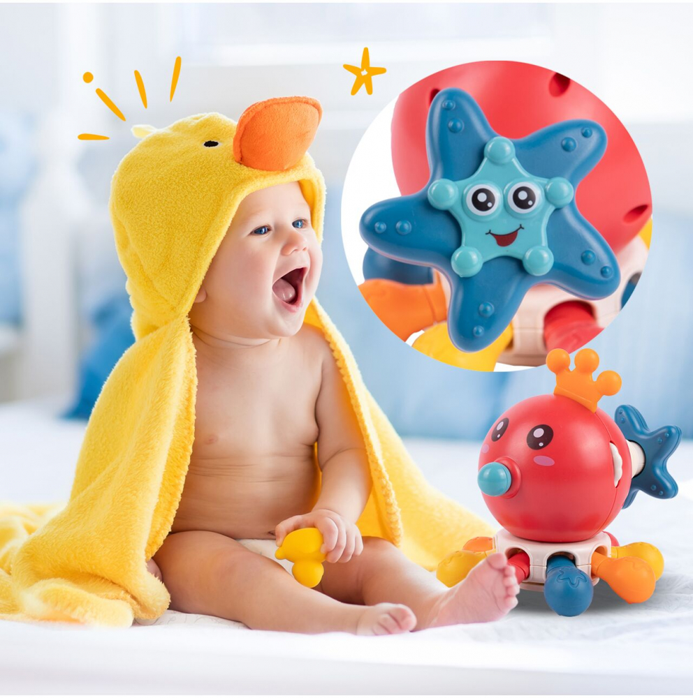 * In partea frontala si cea superioara regasim doua elemente divers colorate din silicon moale: nasul caracatitei de culoare rosie ce poate fi actionat printr-o simpla tragere sau impingere si coronita portocalie in partea de sus cu rol benefic mai ales in perioada dentitiei la bebelusi.