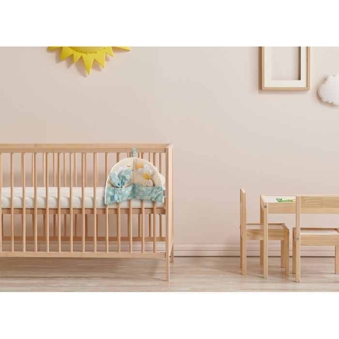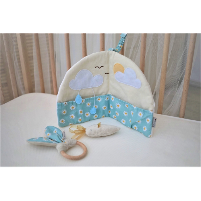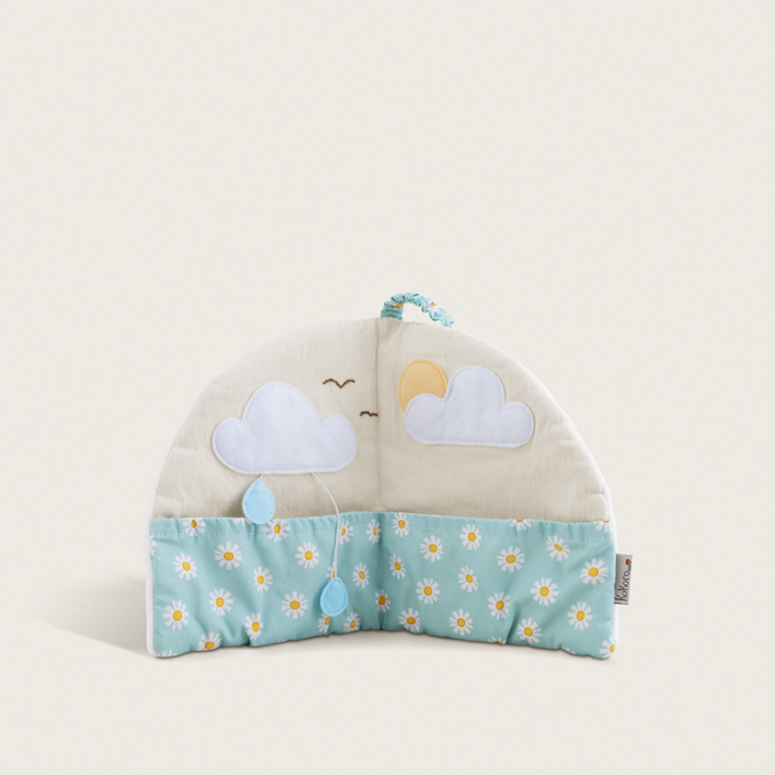 In procesul dezvoltarii coordonarii ochi-mana, jucaria devine un suport ideal pentru exersarea abilitatilor manuale. Prevazuta cu un inel de dentitie, o zornaitoare si alte elemente mobile (ex. picaturile de ploaie), puteti urmari trecerea de la miscari haotice la miscari din ce in ce mai precise si mai intentionate (cum apuca cu toata mana, cum scutura intentionat, cum prinde sau trage cu degetelele). Cele doua buzunare cu care este prevazuta plansa sunt suportul ideal pentru jocul “cucu-bau”, care vizeaza o alta achizitie importanta: permanenta obiectelor (aproximativ la 8 luni, copilul incepe sa caute un obiect care este ascuns sub privirile sale).