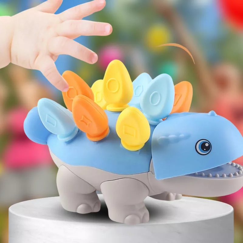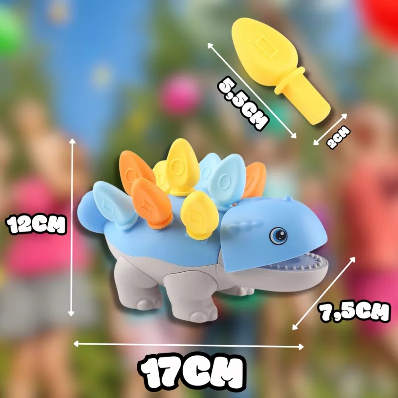 * Este o jucarie de motricitate fina, care ii va ajuta pe copii sa isi construiasca muschii mainilor si sa dezvolte abilitatile motorii fine, in timp ce aseaza "tepii" grosi in gaurile care puncteaza spatele dinozaurului zambitor.