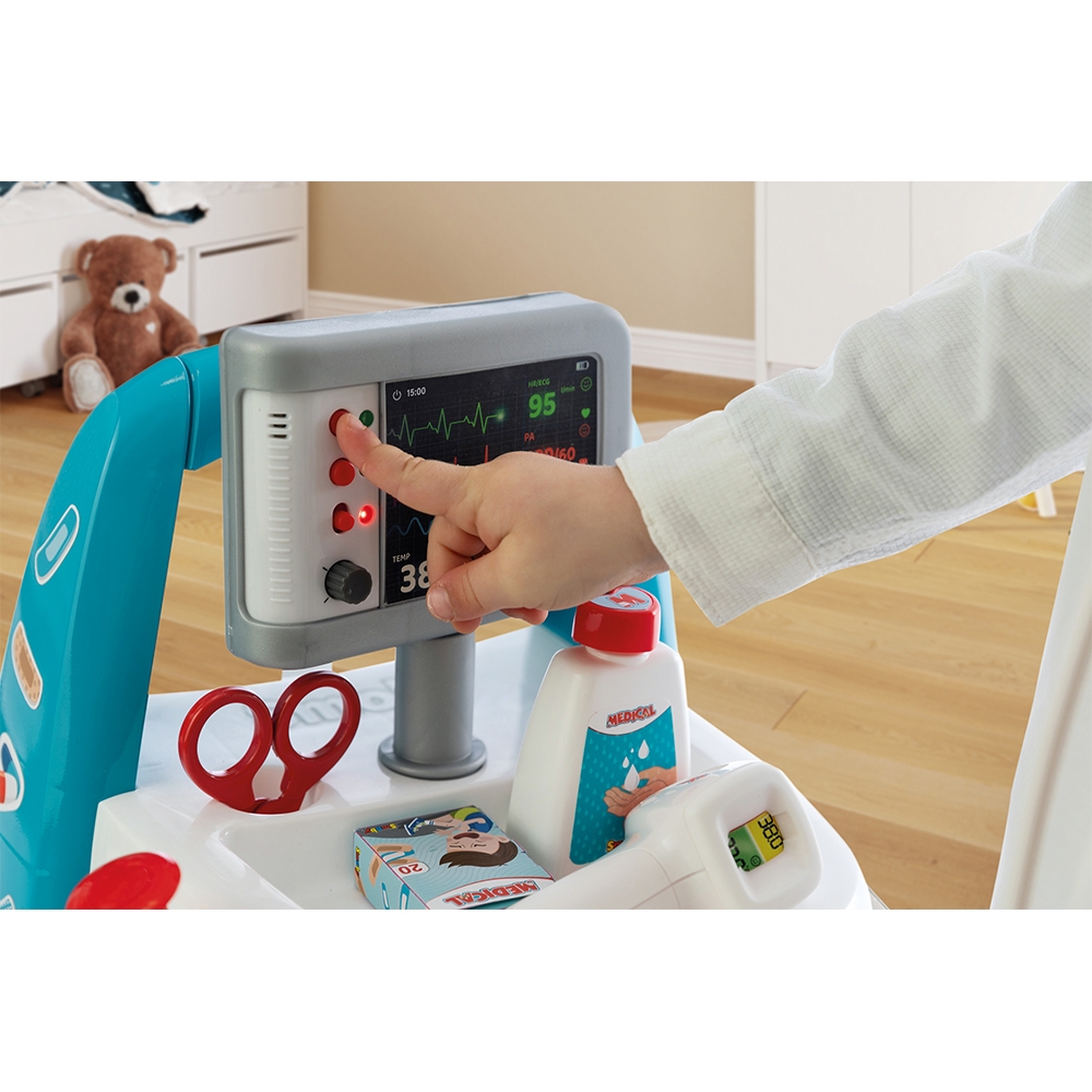 - Setul doctor Smoby cu carucior este o jucarie interactiva cu 16 accesorii, ideala pentru copii incepand cu varsta de 3 ani