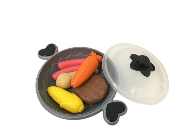 Setul contine:O tigaie si diverse legume de jucarie, cum ar fi morcovi, rosii, broccoli, etc.