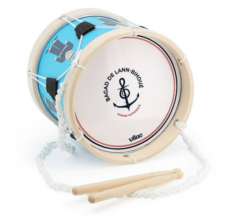 Iata un tambur frumos ilustrat, ce poate fi pus dupa gat datorita snurului impletit.