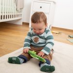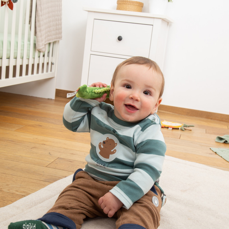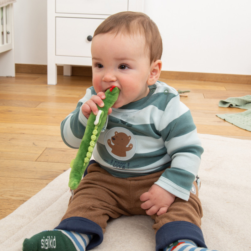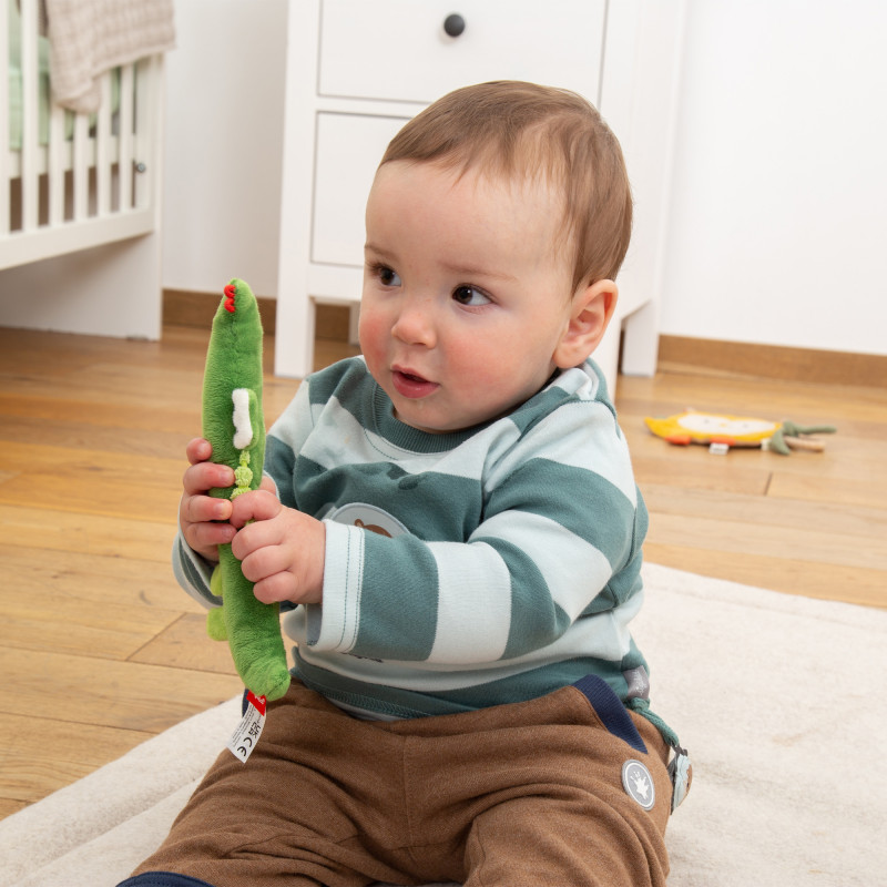 Primele momente de joaca pentru micii iubitori de animale! Acest adorabil crocodil este perfect pentru primele incercari de apucare incepand cu luna a 3-a. Forma sa moale si prietenoasa il face usor de prins de manutele bebelusului, iar la fiecare miscare scoate un sunet amuzant de zornait.