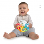 Interiorul manerului contine bilute colorate care zornaie, astfel incat il vor stimula vizual si fonic pe micut