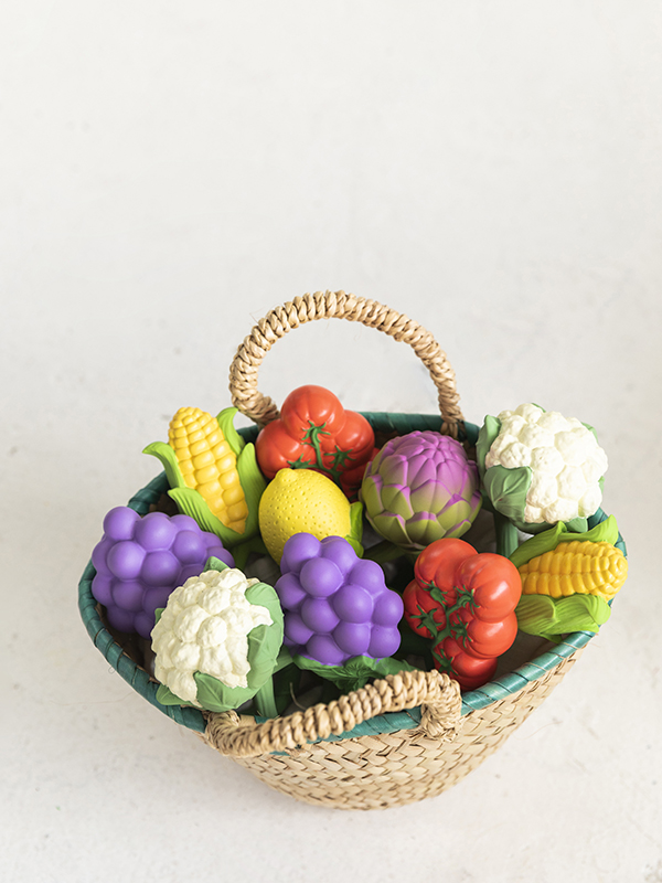 Exteriorul este realizat din cauciuc natural, 100%, iar în interior găsești semințe reciclate de cireșe care transformă această jucărie într-o zornăitoare 2 în 1!
