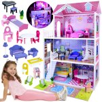 Casuta de papusi din lemn pentru copii Ikonka, cu 4 camere, complet utilata, cu led-uri, dimensiune 62 x 27 x 78 cm