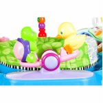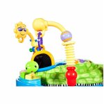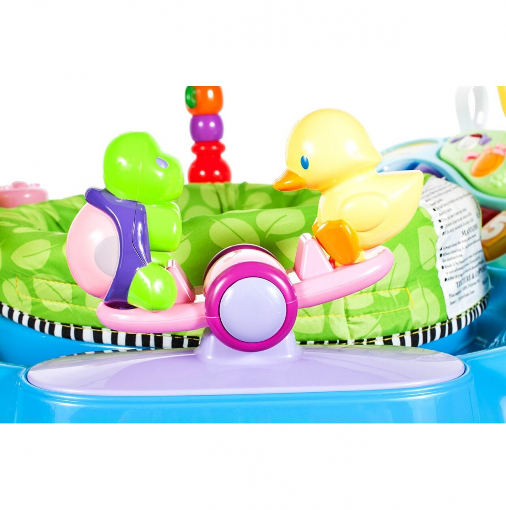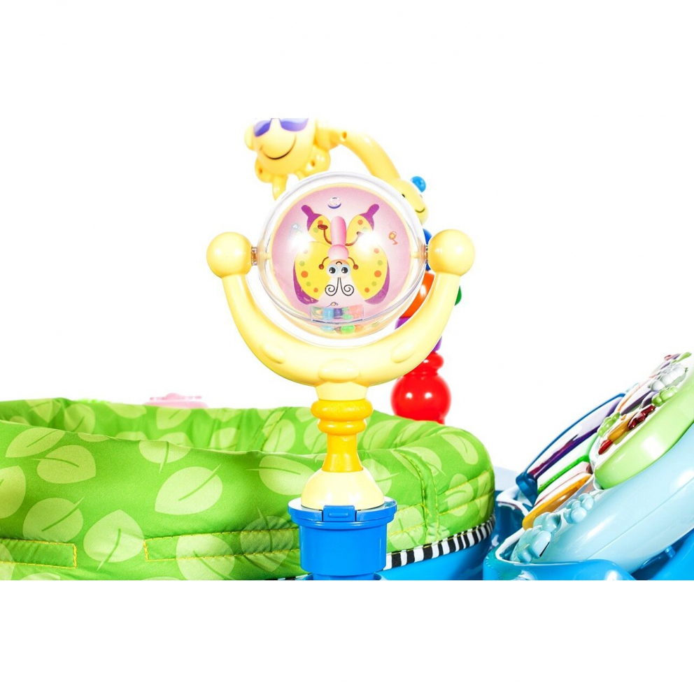 * Scaunul confortabil este inconjurat de jucarii colorate pe arcuri, un pian si zornaitoare colorate.