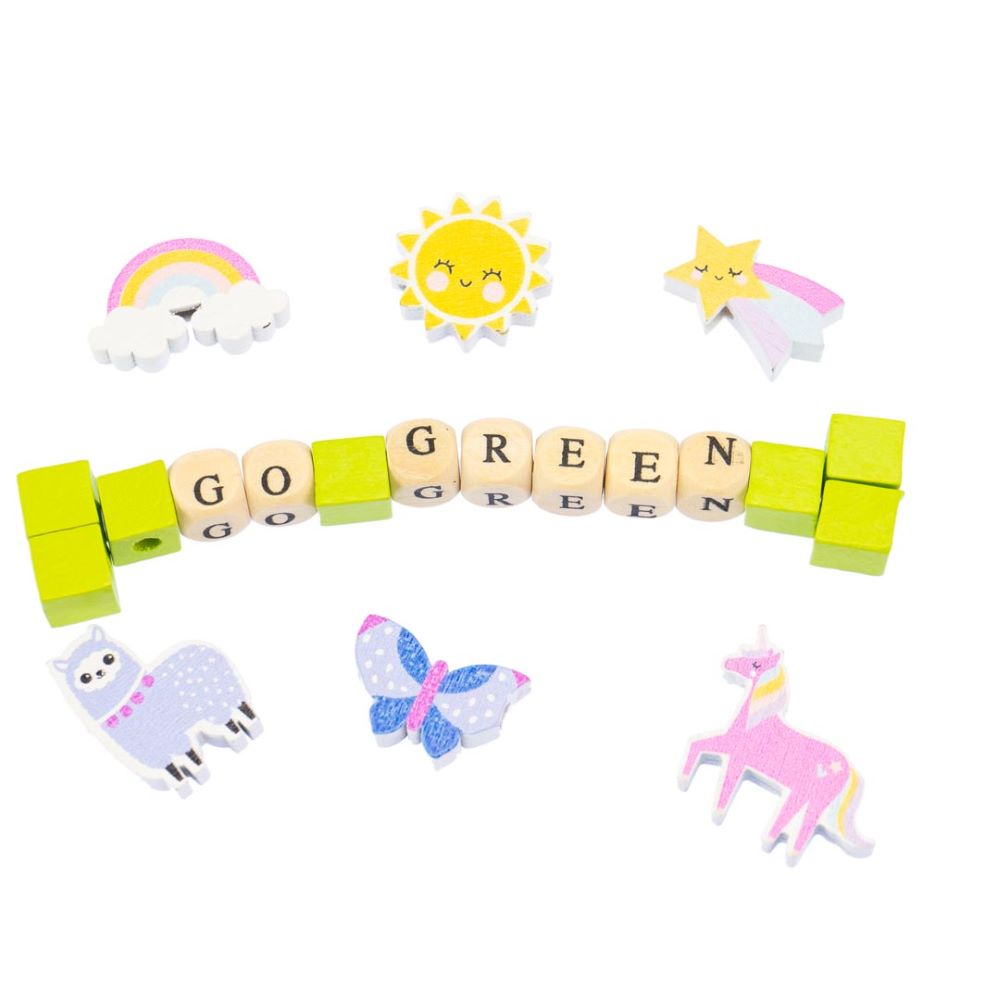 Kit de mărgele din lemn assortite pentru a crea brățări și coliere originale și creative pentru copii, într-o cutie eco-friendly.
