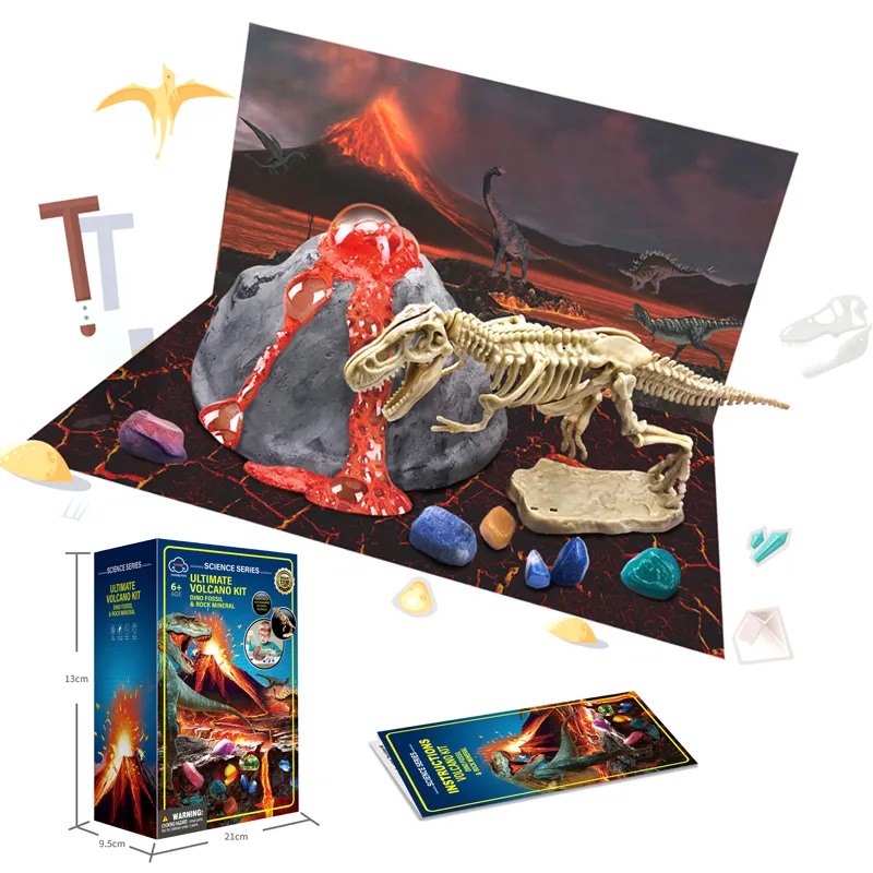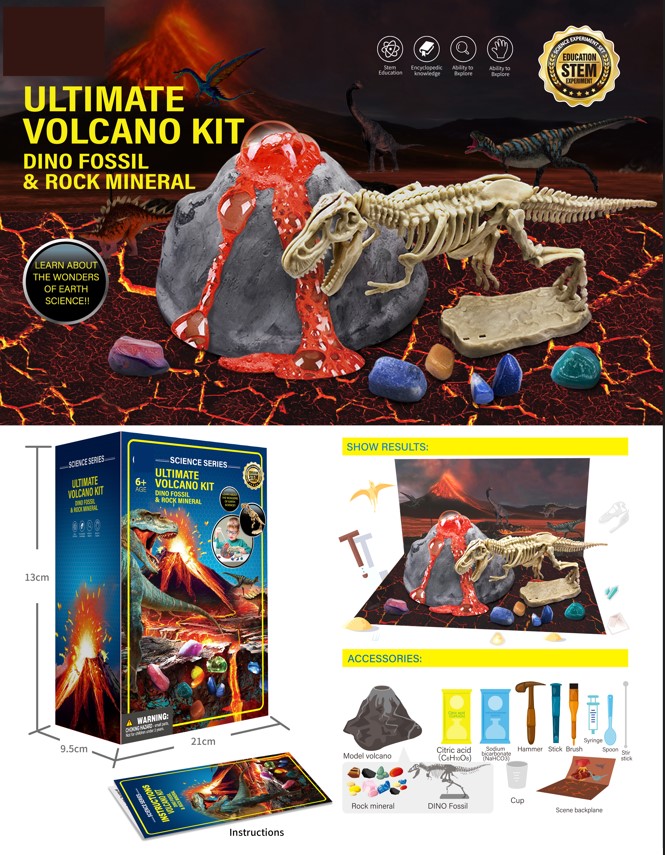 Kit de paleontologie 2 in 1 pentru copii, Ikonka, Vulcanul si fosila Dinozaur