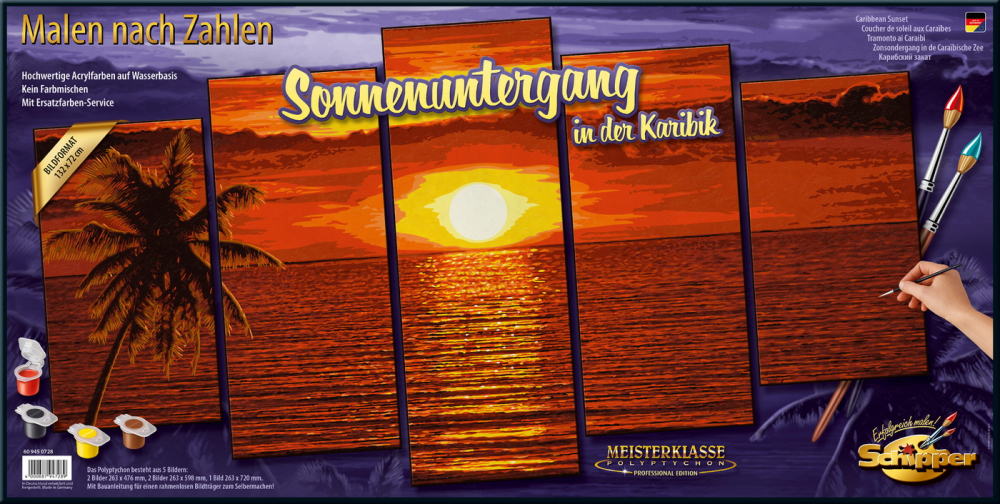 Pictura pe numere, formata din 5 tablouri, cu dimensiunea totala de 132*72 cm, din carton cu textura din panza, cu desen conturat in numere, culorile si pensula sunt incluse.
