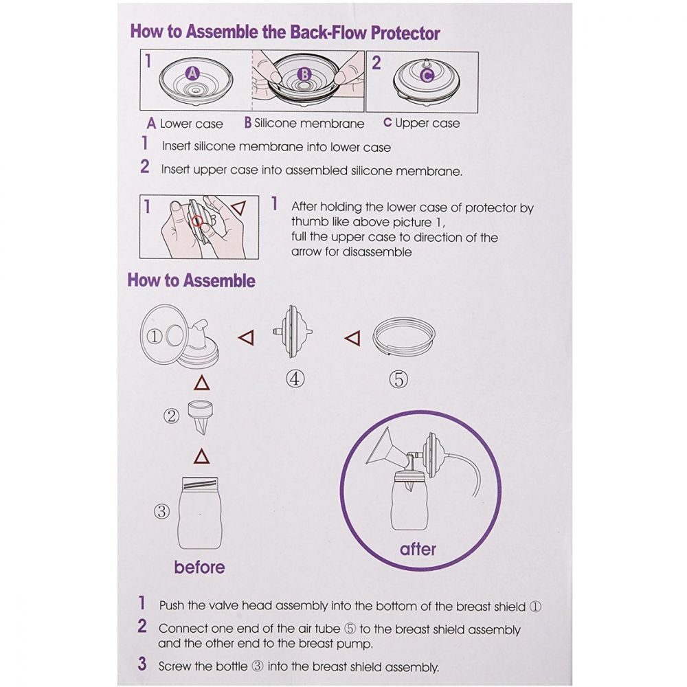 Atentie! Acest produs este un accesoriu pentru dispozitive medicale si are un caracter igienico - sanitar. El nu se returneaza, daca a fost desigilat conform Art. 16 lit. e). Componentele care intra in contact cu laptele trebuiesc sterilizate inainte de fiecare utilizare. Laptele matern poate fi stocat 72 de ore in frigider si pana la 3 luni in congelator. Laptele matern nu se incalzeste la microunde si nu se fierbe. Folosirea componentelor la mai multe persoane poate duce la transmiterea diverselor boli.