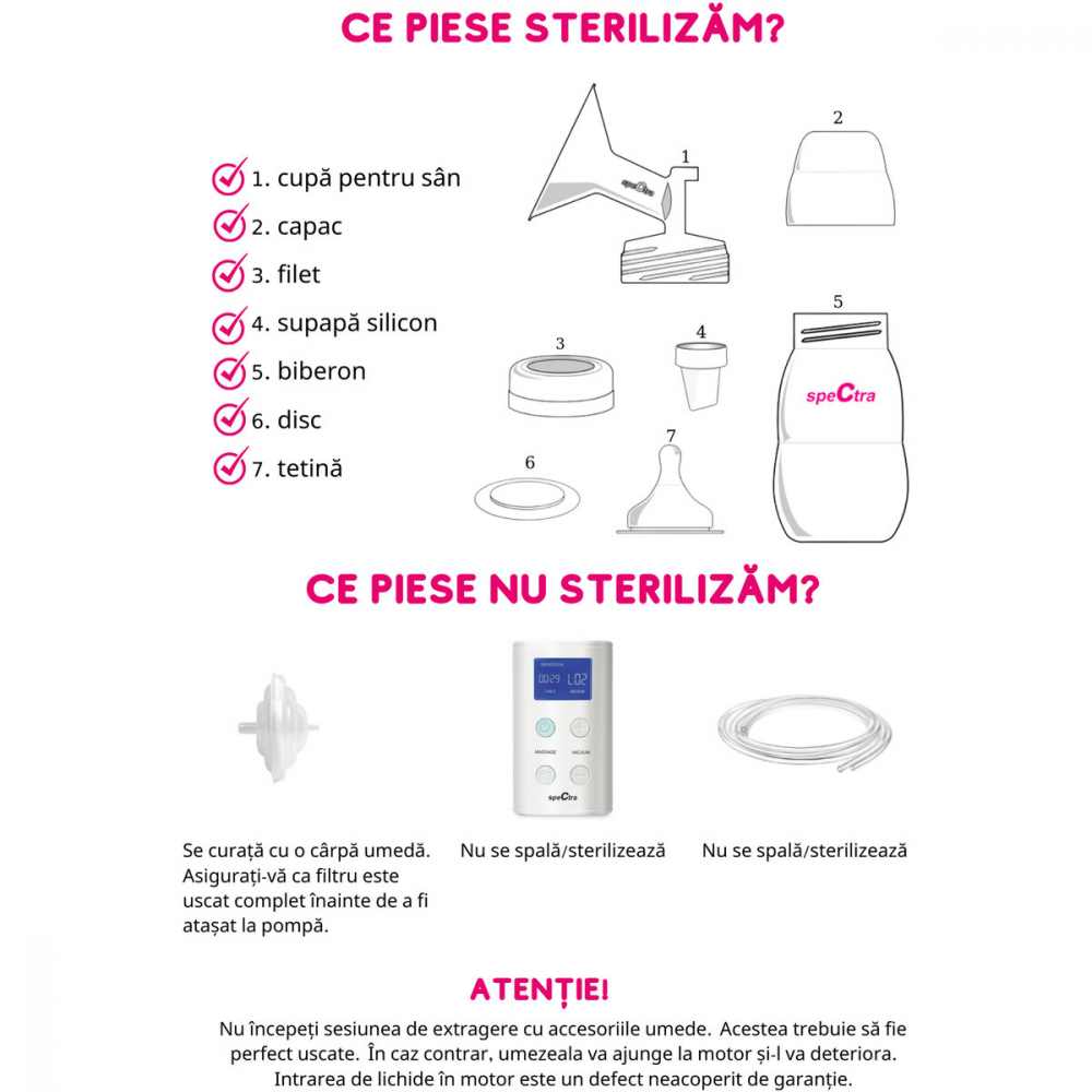 • Componentele care intra in contact cu laptele trebuiesc sterilizate inainte de fiecare utilizare
