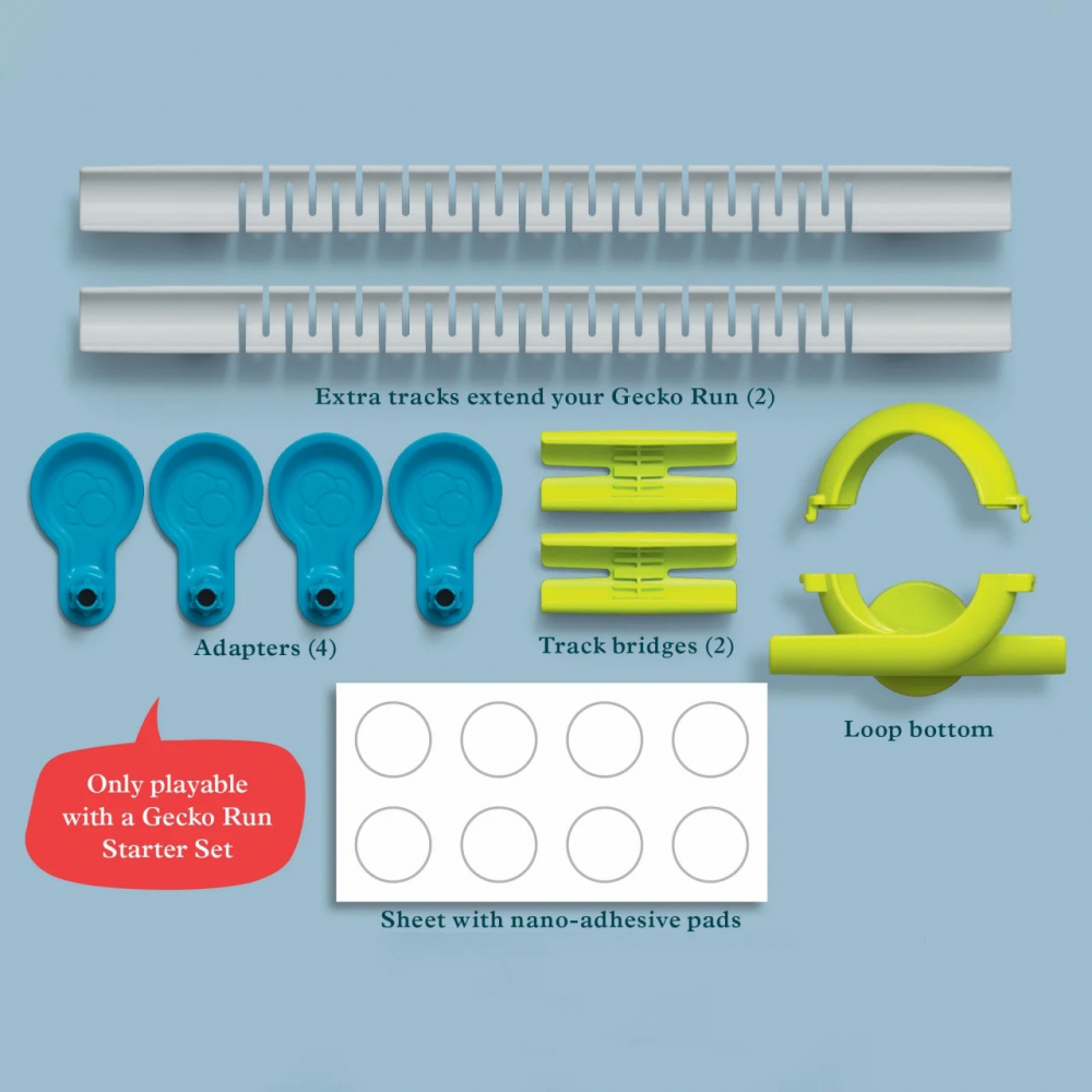 Peste o duzină de piese care completează setul de pornire Gecko Run; bile suplimentare și tampoane nanoadezive; 2 piste suplimentare; și multe altele.