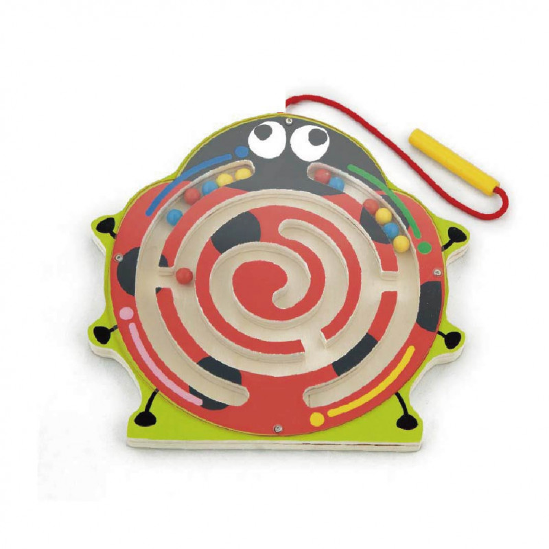 O bagheta magnetica, care trebuie manevrata cu mana, strecoara margelele colorate prin labirint.