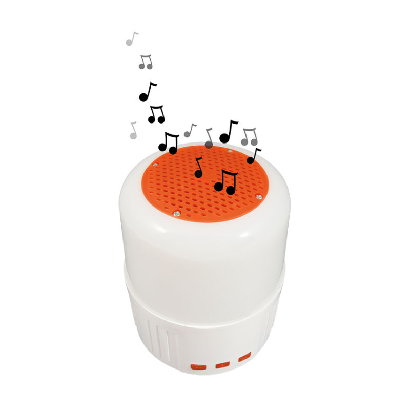 O lanternă de camping reîncărcabilă cu funcție de difuzor Bluetooth. Se încarcă prin panoul solar încorporat sau prin cablul USB.