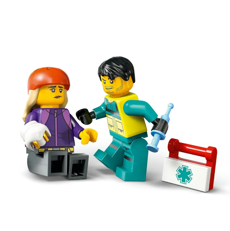 Setul mai include un skateboard si o rampa de skate, plus minifigurinele skatboarder si paramedic pentru joaca de roluri.