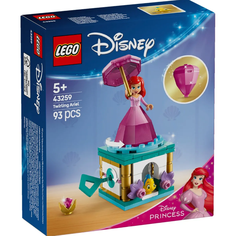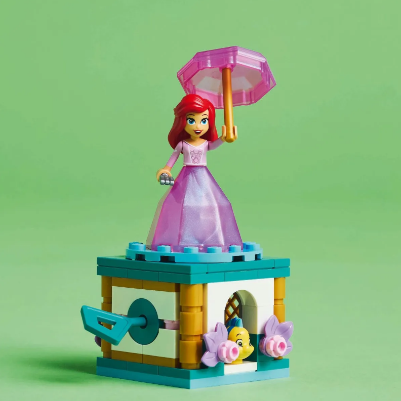 Incanta copiii si fanii filmului Disney Mica sirena de 5 ani+ cu setul de constructie LEGO Disney Princess Ariel facand piruete (43259), care include un stativ fantasy construibil cu placa rotativa, o cheie, o furculita si spatiu pentru Flounder, plus un diamant pe partile laterale.